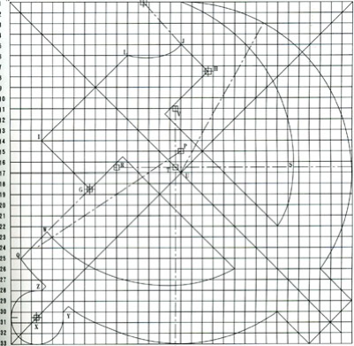 3 鐮刀的畫法:以M點(diǎn)(17、17′)為圓心、MN(N點(diǎn)為17、1′)為半徑畫弧⌒NO(O點(diǎn)為17、33′);以P點(diǎn)(17、15′)為圓心、PO為半徑畫弧,與HG的延長(zhǎng)線交于Q點(diǎn);以R點(diǎn)(1116′、17′中點(diǎn))為圓心、RN為半徑畫弧,與通過R點(diǎn)的水平線交于S點(diǎn);以T點(diǎn)(16、1716′、17′的中點(diǎn))為圓心、TS為半徑畫弧,與通過T點(diǎn)的垂直線交于U點(diǎn);以V點(diǎn)(16、1711′中點(diǎn))為圓心、VU為半徑畫弧,與HG的延長(zhǎng)線交于W,構(gòu)成鐮刀。以X點(diǎn)(3、430′、31′的中點(diǎn))為圓心作圓與AB、BC線相切,從Y點(diǎn)(6、30′)、Z點(diǎn)(4、28′)分別作直線平行于BD,構(gòu)成鐮刀把。